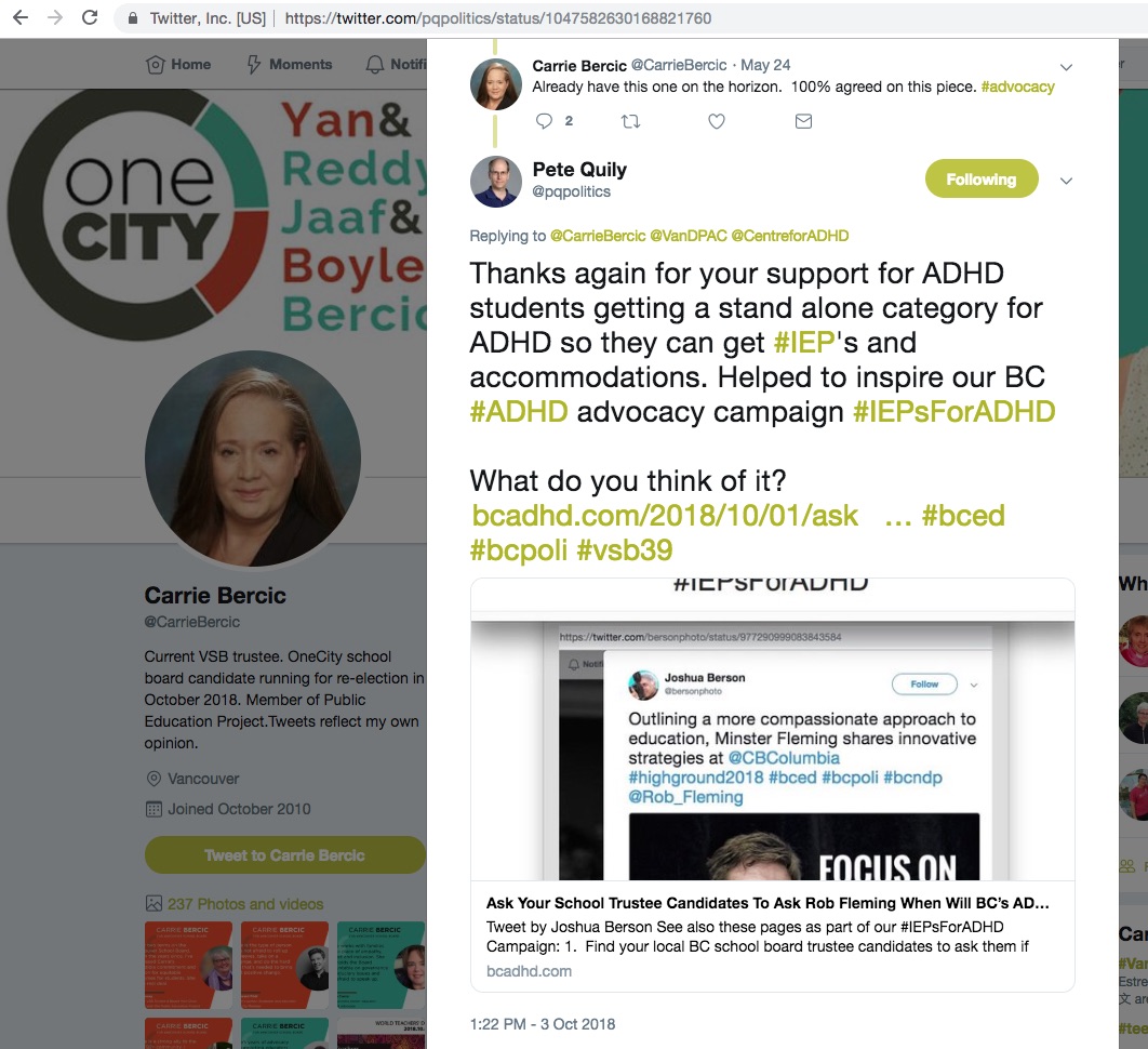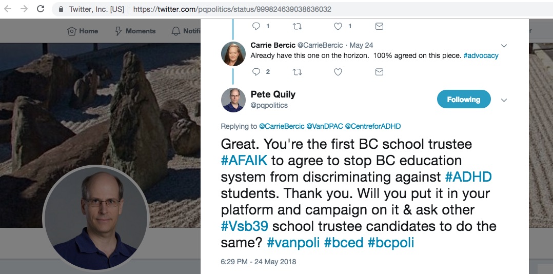 I have been asking BC school trustees for several elections if they would support a stand-alone category for ADHD in special education so ADHD students can get accommodations and IEP’sfor several election cycles with either no response or the usual politician pretending to care but doing nothing was frustrating.