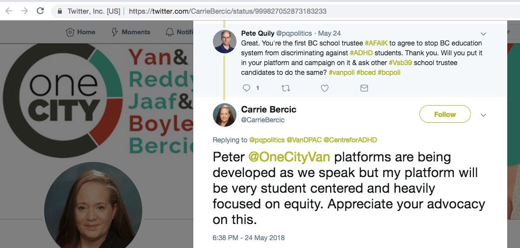 Great. You're the first BC school trustee #AFAIK to agree to stop BC education system from discriminating against #ADHD students. Thank you. Will you put it in your platform and campaign on it & ask other #Vsb39 school trustee candidates to do the same? #vanpoli #bced #bcpoli