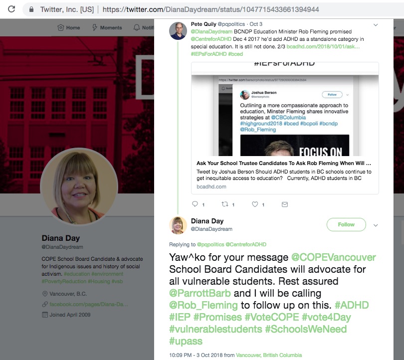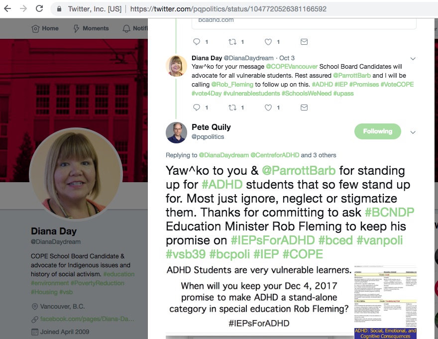 Thanks Diana DayDream and Barb Parrott I hope other school board Trustees in Vancouver will follow your lead and commit to asking BC Education Minister Rob Fleming when he will fulfil his promise to ADHD students add ADHD as a stand-alone category in special education that he made more than 10 months ago (December 4th 2017).