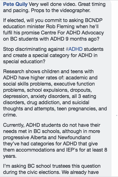 So thanks for standing up for people that so few are willing to, students with ADHD and committing to asking BCNDP education minister Rob Fleming when he’ll fulfil his 9 month old promise to add ADHD as a stand alone category in special education so ADHD students can #IEPsForADHD “