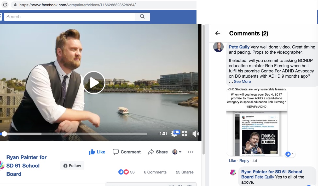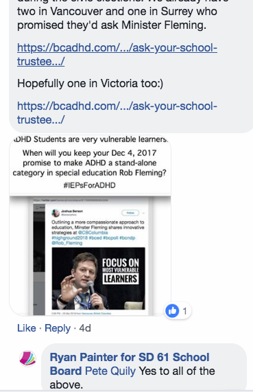 Thanks Ryan Painter I hope other school board Trustees in Victoria will follow your lead and commit to asking BC Education Minister Rob Fleming when he will fulfil his promise to ADHD students add ADHD as a stand-alone category in special education that he made more than 10 months ago (December 4th 2017).