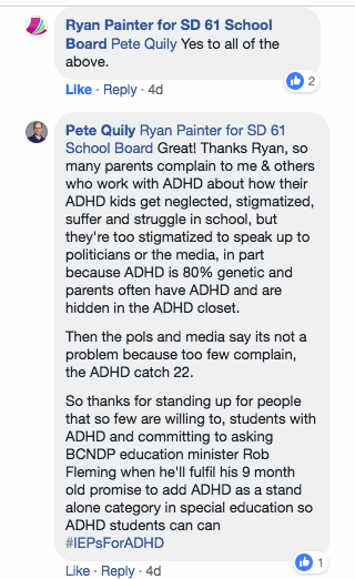“Pete Quily Ryan Painter for SD 61 School Board Great! Thanks Ryan, so many parents complain to me & others who work with ADHD about how their ADHD kids get neglected, stigmatized, suffer and struggle in school, but they’re too stigmatized to speak up to politicians or the media, in part because ADHD is 80% genetic and parents often have ADHD and are hidden in the ADHD closet.