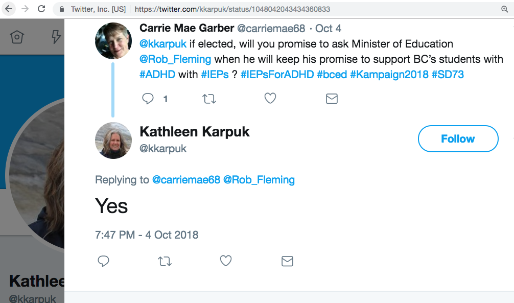 Thanks Kathleen Karpuk I hope other school board Trustees in Kamloops will follow your lead and commit to asking BC Education Minister Rob Fleming when he will fulfil his promise to ADHD students add ADHD as a stand-alone category in special education that he made more than 10 months ago (December 4th, 2017).