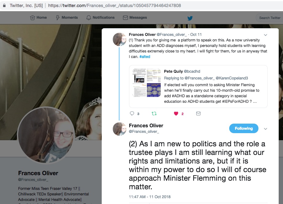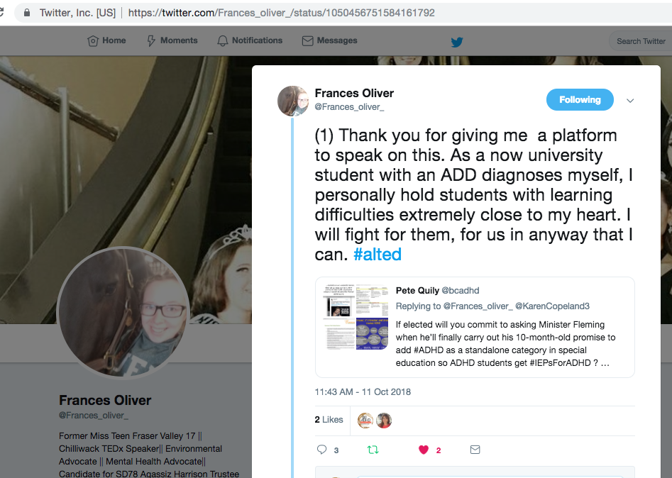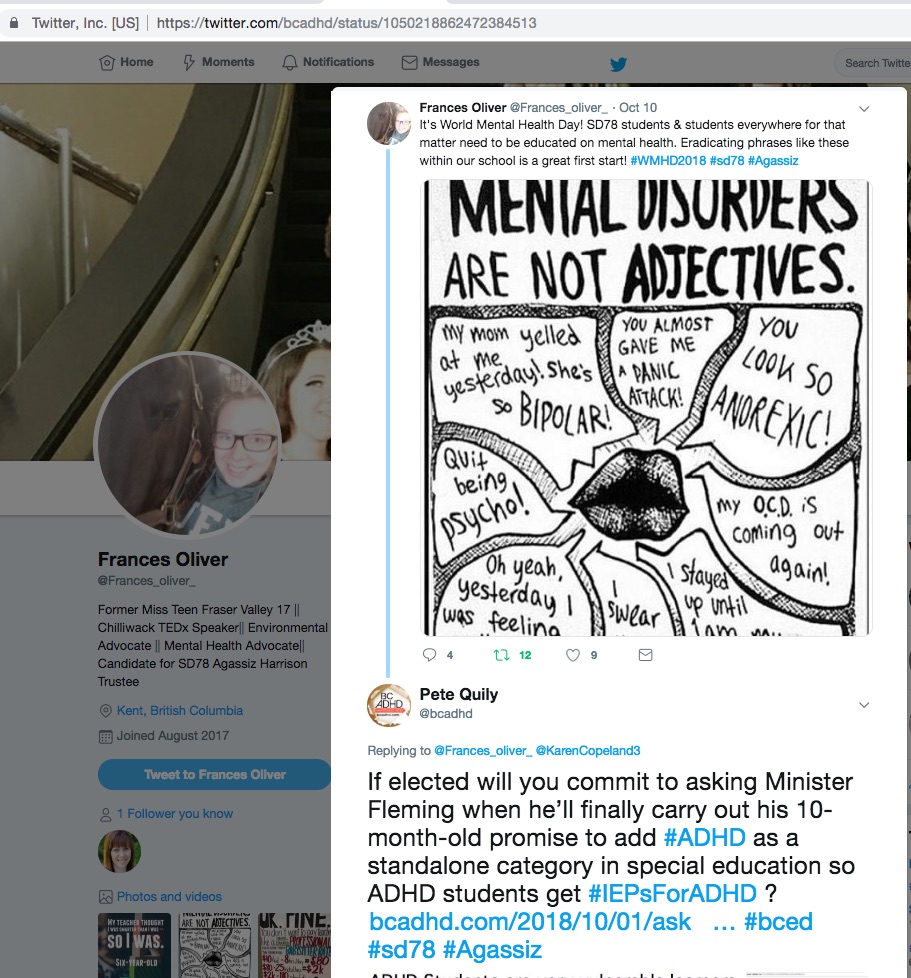 Frances Oliver Twitter @Frances_oliver_ Fraser-Cascade SD78 school board candidate in Agassiz Harrison supports ADHD students in BC schools and will ask BC Education Minister Rob Fleming to follow through on his promise to ADHD students in BC to add ADHD as a stand-alone category in special education so ADHD students can get accommodations and IEP’s (Individual Education Programs.) #IEPsForADHD