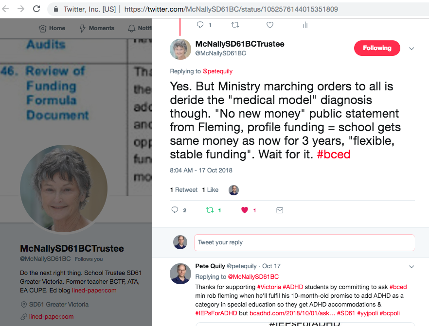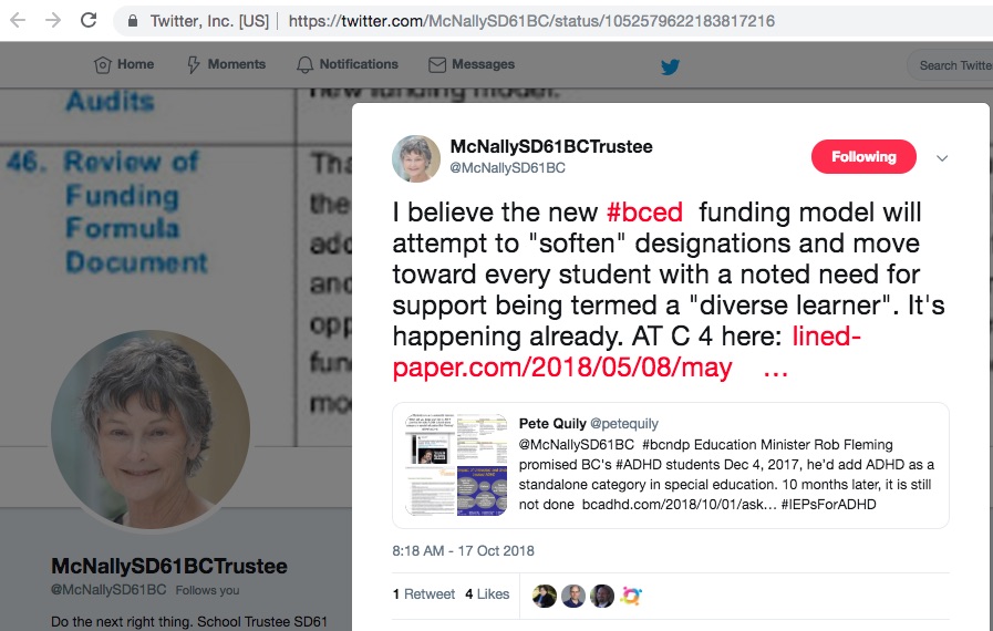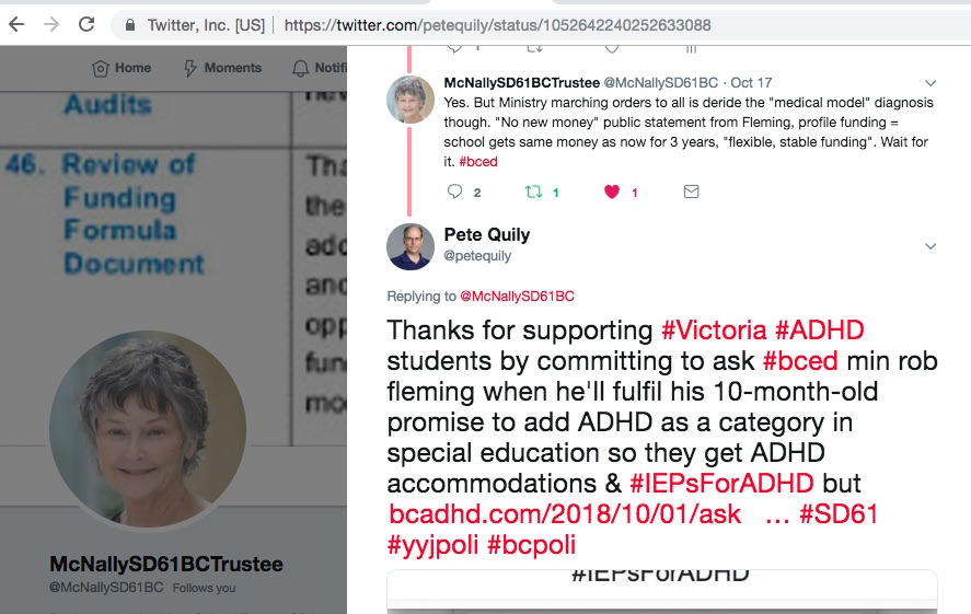 Thanks McNallySD61BC I hope other school board Trustees in Victoria will follow your lead and commit to asking BC Education Minister Rob Fleming when he will fulfil his promise to ADHD students add ADHD as a stand-alone category in special education that he made more than 10 months ago (December 4th, 2017).