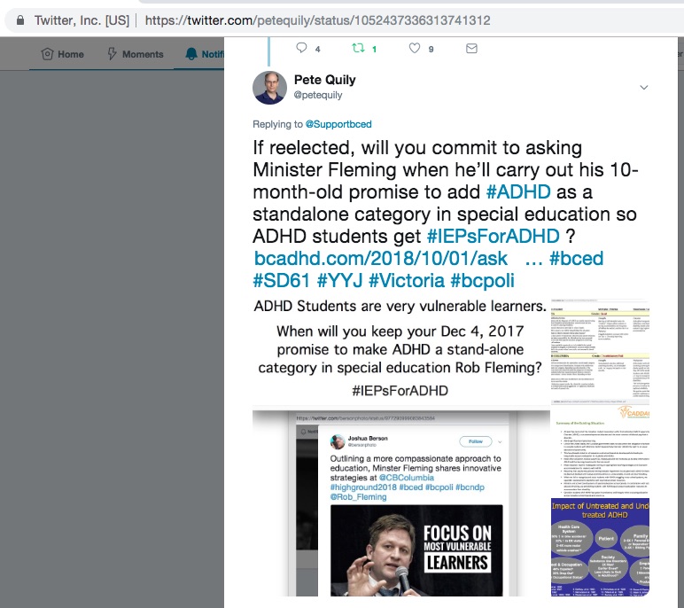 If reelected, will you commit to asking Minister Fleming when he’ll carry out his 10-month-old promise to add #ADHD as a standalone category in special education so ADHD students get #IEPsForADHD ? https://t.co/zRe6pQEmYY #bced #SD61 #YYJ #Victoria #bcpoli pic.twitter.com/guf4kaf6TX