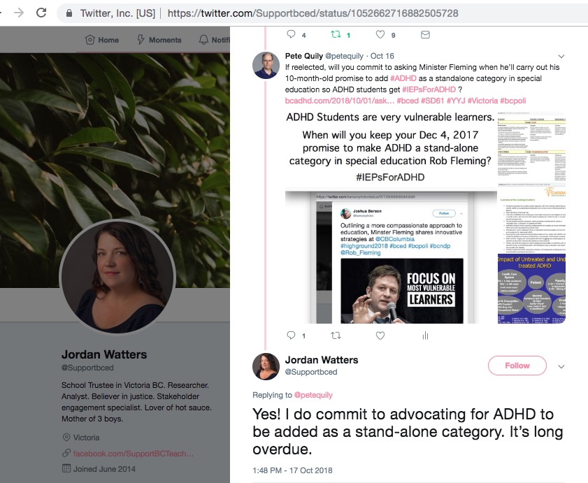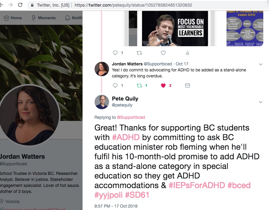 Thanks @Supportbced I hope other school board Trustees inVictoria will follow your lead and commit to asking BC Education Minister Rob Fleming when he will fulfil his promise to ADHD students add ADHD as a stand-alone category in special education that he made more than 10 months ago (December 4th, 2017).