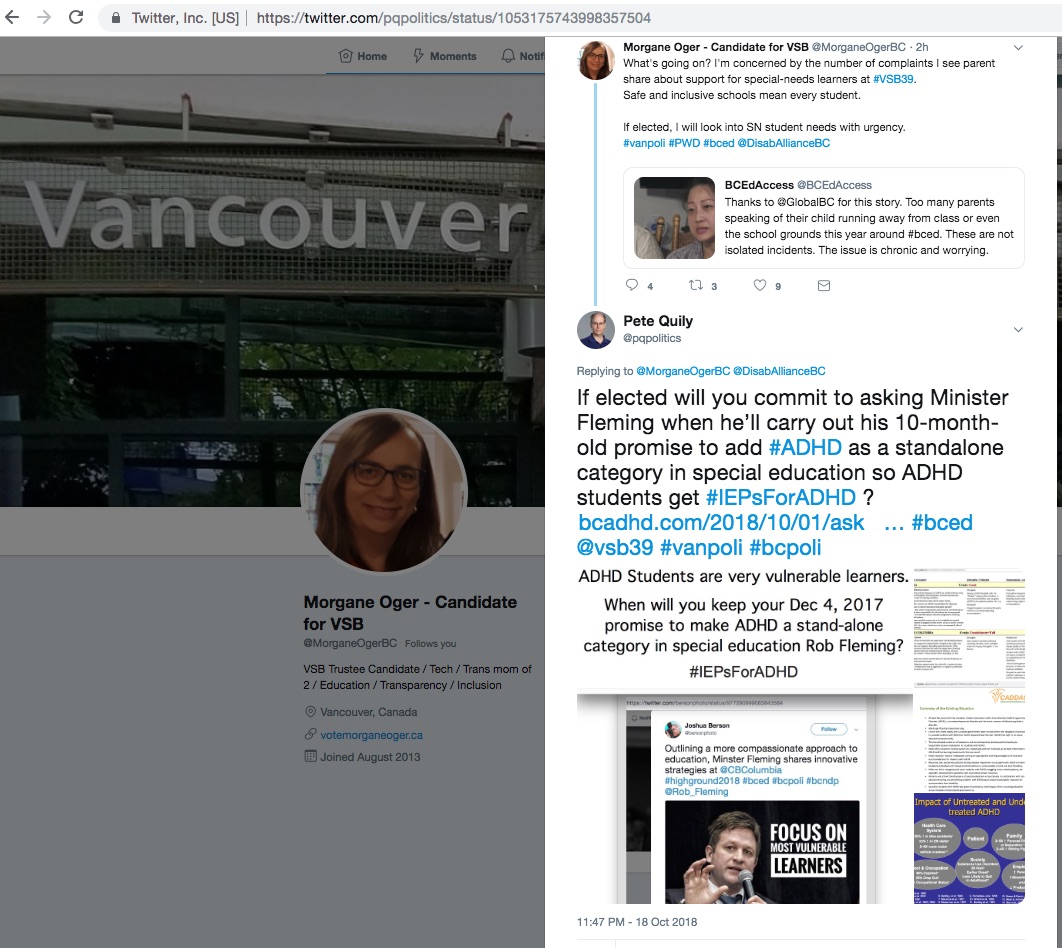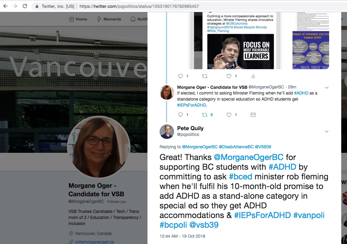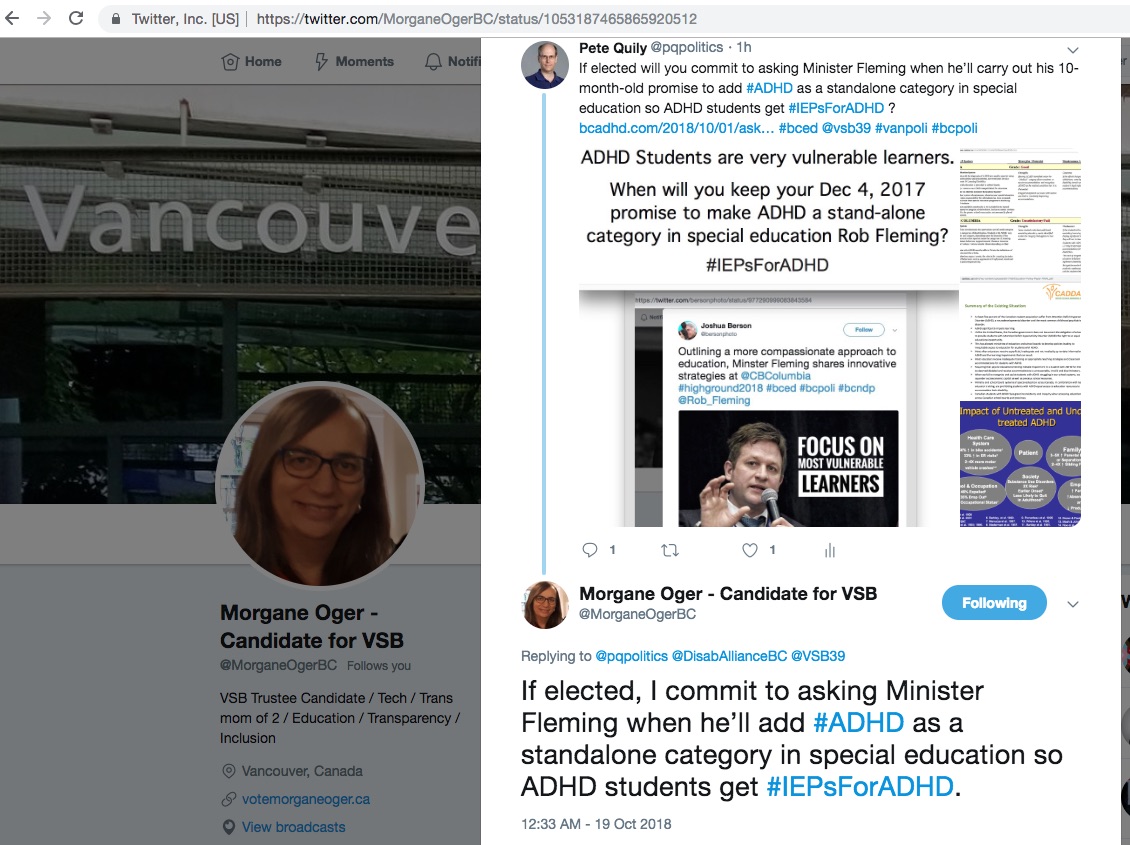 Thanks @MorganeOgerBC I hope other school board Trustees in Vancouver will follow your lead and commit to asking BC Education Minister Rob Fleming when he will fulfil his promise to ADHD students add ADHD as a stand-alone category in special education that he made more than 10 months ago (December 4th, 2017).