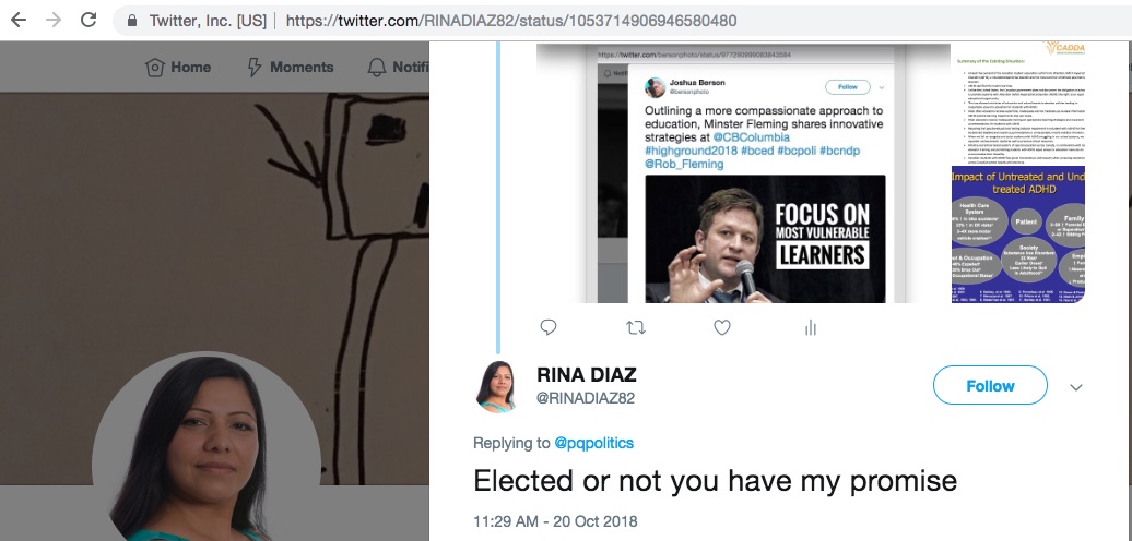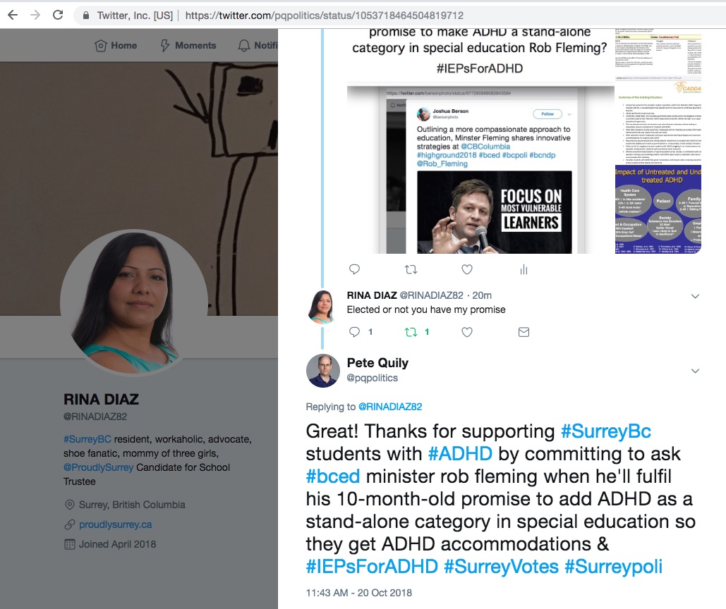 Thanks @RINADIAZ I hope other school board Trustees in Surrey will follow your lead and commit to asking BC Education Minister Rob Fleming when he will fulfil his promise to ADHD students add ADHD as a stand-alone category in special education that he made more than 10 months ago (December 4th, 2017).
